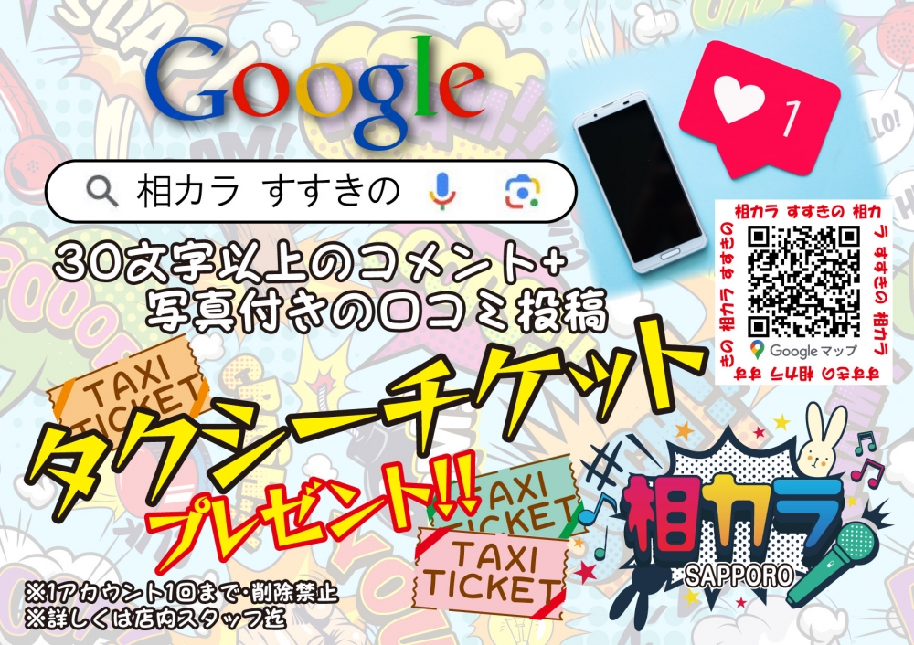 相カラでは現在Googleの口コミ投稿をしていただくとタクシーチケットをお渡ししております!(30文字以上で写真付き投稿に限る)